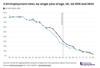In the UK, 70.9% of those aged between 50 and 64 were in work in 2024. A modest year-on-year increase, but notably down from the high of 72.5% in 2019, before the COVID-19 pandemic. At age 65, the UK employment rate drops to 40.4%, and this drops further to 30.1% at age 66, in line with the UK state pension age of 66.